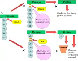 DUBs play several roles in the ubiquitin pathway. One of the best characterised functions of DUBs is the removal of monoubiqutin and polyubiquitin chains from proteins. These modifications are a post translational modification (addition to a protein after it has been made) where single ubiquitin proteins or chains of ubiquitin are added to lysines of a substrate protein. These ubiquitin modifications are added to proteins by the ubiquitination machinery; ubiquitin-activating enzymes (E1s), ubiquitin-conjugating enzymes (E2s) and ubiquitin ligases (E3s). The end result is ubiquitin bound to lysine residues via an isopeptide bond.[12] Proteins are affected by these modifications in a number of ways: they regulate the degradation of proteins via the proteasome and lysosome; coordinate the cellular localisation of proteins; activate and inactivate proteins; and modulate protein-protein interactions.[3][4][5] DUBs play the antagonistic role in this axis by removing these modifications, therefore reversing the fate of the proteins.[2] In addition, a less understood role of DUBs is the cleavage of ubiquitin-like proteins such as SUMO and NEDD8. Some DUBs may have the ability to cleave isopeptide bonds between these proteins and substrate proteins.[13]