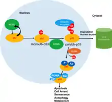In healthy cells, p53 activates the E3 ubiquitin ligase MDM2 which in turn ubiquitinates p53. This creates a negative feedback loop, whereby the degradation of p53 allows for cells to flow through the cell cycle.[46] Upon DNA damage, Ubiquitin-specific-processing protease 7 (USP7) stabilizes p53 by cleaving ubiquitin.[47] For USP7 to deubiquitinate p53, it must localize to the nucleus. However, no nuclear localization sequence (NLS) has been found.[48] Despite no known NLS, one study showed that, upon deletion of USP7’s N-terminus, no nuclear localization occurred.[48] It is possible that other proteins facilitate nuclear entry of USP7.