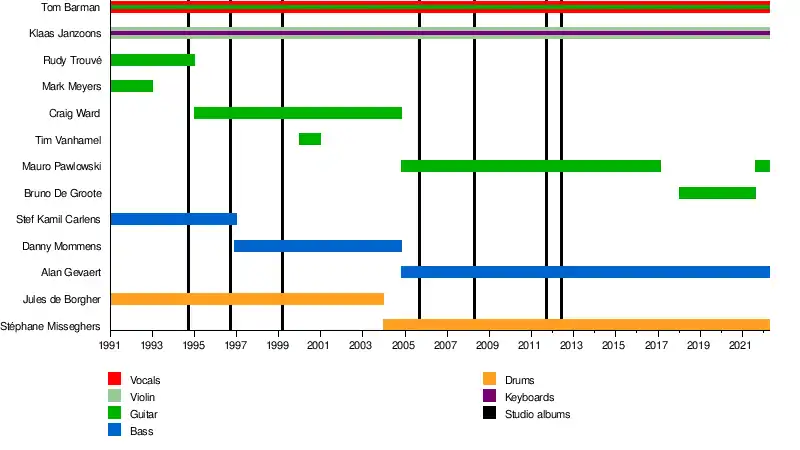 In October 2016, they announced through Facebook that Mauro Pawlowski would leave the band after a final concert in Antwerp the following February. On 6 February 2018, they announced through Facebook that Bruno De Groote will be the new guitar player of the band.[16]