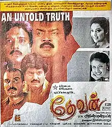 Devan is a 2002 Indian Tamil-language action film directed by Arun Pandian making his debut as director. The film stars himself in the title role being his 50th project as actor[1] with Meena and Kausalya , while Vivek and Malayalam actor Sai Kumar play supporting roles. Actors Karthik, Senthil, and Vijayakanth appear in guest appearances. Sai Kumar had made his Tamil debut with this film. The music was composed by Ilaiyaraaja. The film was released on 14 June 2002 and was also dubbed in Hindi as Vidrohi.[2]