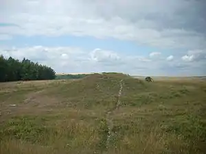 The Devil's Jumps are a group of five large bell barrows situated on the South Downs 1.2 kilometres (0.75 mi) south-east of Treyford in the county of West Sussex in southern England.[1] The Devil's Jumps site is listed as a Scheduled Ancient Monument and as a Local Nature Reserve.[2] Most barrows along the South Downs have been damaged by agriculture and treasure hunters but the Devil's Jumps are considered to be the best preserved Bronze Age barrow group in Sussex.[3] The barrows are laid out in a line running approximately south-east to north-west.[4] The five barrows vary in diameter from 26 to 34 metres (85 to 112 ft) and stand up to 4.8 metres (16 ft) high.[5] Two smaller barrows were situated close to the five main mounds.[6] Traces remain of a sixth barrow.[7] The Devil's Jumps have been dated to the Bronze Age and they are believed to be between three and four thousand years old.[8] The Devil's Jumps were explored in the 19th century, when bones were found in two of the mounds,[9] although some of the barrows contained no cremated remains at all.[10] The main line of five barrows is aligned with sunset on Midsummer Day.[11]