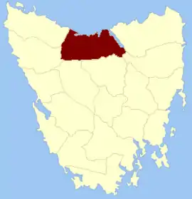 Devon Land District is one of the twenty land districts of Tasmania which are part of the Cadastral divisions of Tasmania. It was formerly one of the 18 counties of Tasmania. The 1911 Encyclopædia Britannica describes Beaconsfield[1] and Devonport[2] as being in the county. It is bordered by the Tamar River in the east, and the Emu River near Burnie in the west. Deloraine is on the southern edge with the border with Westmoreland Land District. It is named after the English county of Devon.