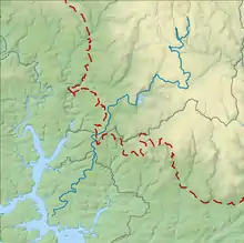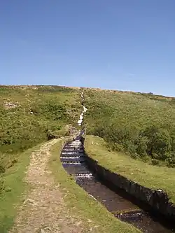 The Devonport Leat begins a short distance to the north of Wistman's Wood[3] at an altitude of over 410 metres (1,350 ft) and twice passes close to Two Bridges[4] (following the contours up the Cowsic valley in between) before heading towards Princetown.[5] Its water supply now ends up in Burrator Reservoir.[6] It follows a meandering path across the moor, carefully selected by engineers to follow the natural contours of the land.[7]