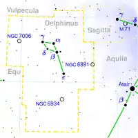 Dhanishtha (Devanagari: धनिष्ठा), (Tamil: அவிட்டம்), (Malayalam: അവിട്ടം), (Telugu: ధనిష్ఠ) and (Kannada: ಧನಿಷ್ಠಾ) is the twenty-third nakshatra in Hindu astronomy, corresponding to α to δ Delphini. It is also known as Avittam in Malayalam and Tamil.[1] In Jyotiṣa, Dhanishta is ruled by Mangala (the planet Mars). Dhanishta is classified as a movable nakshatra, meaning that, under electional astrological beliefs, it is best to begin activities like travel when the moon is in Dhanishta.[2] This is based on the Panchanga reading only (which is also known as a calendar to track the suitable day for doing or starting anything good).