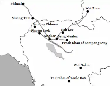 In 1902, Lunet de Lajonquière rediscovered the regularly-spaced temples along the Nortwest an East roads. The dharmasalas are normally found to the North of the routes.[10]
