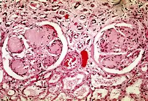 | Two glomeruli in diabetic nephropathy: the acellular light purple areas within the capillary tufts are the destructive mesangial matrix deposits. | |