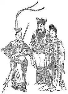 Chinese historical records indicate that Lü Bu had a secret affair with one of Dong Zhuo's maids and he constantly feared that Dong Zhuo would find out. This was one of the reasons why he betrayed and assassinated Dong Zhuo in 192. The maid's name was not recorded in history, however.[1] The name "Diaochan", which literally means "sable cicada", is believed to have been derived from the sable tails and jade decorations in the shape of cicadas which adorned the hats of high-ranking officials in the Eastern Han dynasty.