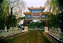 The Diaoyutai State Guesthouse (DSG)[1][2] (simplified Chinese: 钓鱼台国宾馆; traditional Chinese: 釣魚臺國賓館; pinyin: Diàoyútái Guóbīnguǎn) is a diplomatic complex in Haidian District, Beijing, China, where the Chinese state leadership offers receptions to visiting foreign dignitaries. It includes a number of villas and gardens. The hotel complex is mentioned as one of the Ten Great Buildings, a list of landmarks constructed in 1959 for the 10th anniversary of the People's Republic of China.