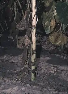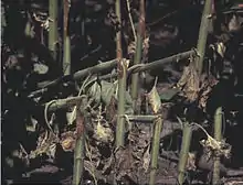 Stem canker on sunflower is caused by the fungal pathogen Phomopsis helianthi (teleomorph = Diaporthe helianthi).[1] There are many "Phomopsis" species that have a broad host range, but "Phomopsis helianthi" is the primary pathogen that infects sunflower, although it has also been seen to infect other, secondary hosts. Some "Phomopsis" species have been found to be able to cause disease on several host genera.[2] Sunflower hosts that found in high densities are particularly susceptible to attack by the pathogen due to the microclimate formed in crowded areas. This microclimate has a high humidity and allows for infection to proceed rapidly.[3] There has also been recent molecular evidence to suggest there are several genetically distinct species of Phomopsis that can cause disease on the sunflower hosts.[3]