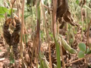 Disease symptoms occur primarily on the stems, leaves and can lead to whole plant symptoms.[2] Reddish brown lesions on the lower stem of soybean plants progress into brown cankers. In some cases, the disease can spread to all parts of the stem. Stem girdling can result in premature plant death.[2] Grey streaking along the lower stem and taproot has also been observed. Studies suggest a toxin may influence the development and symptomology of stem canker.[7] Leaf symptoms include interveinal chlorosis and necrosis during early reproductive stages. Leaves eventually dry and fall off the plant as the disease worsens.[4] Stem canker has similar symptomology as brown stem rot, fusarium wilt, phytopthora stem rot, sudden death syndrome, tobacco streak virus, and sclerotinia stem rot, which can make distinguishing this disease particularly difficult.[6] Stem canker can be differentiated primarily by its long dark red or brown canker that can extend over multiple nodes. Inside the stem, discoloration is localized to areas near the canker or lesion.[6]