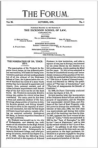 Dickinson Law Review is the flagship law review of Penn State Dickinson Law. Founded in 1897 as The Forum, it is the fifth oldest law review in continuous print in the United States.[1] From 1898-1899, Julia Radle, the first female student in the school's history, was the editor-in-chief of the law review. It is believed that Ms. Radle may have been the first female in the United States to serve in this capacity.[2]