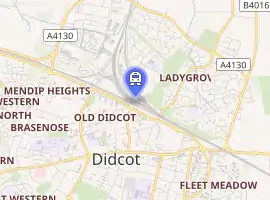 The station is located just to the north of the town centre in Didcot. It can only be accessed by car from Station Road itself on the south side of the railway, although passengers may park in Foxhall Road Long Stay Car Park, situated on Basil Hill Road, and cross a footbridge to the station. The station entrance is at road level; platforms 2-5 may be accessed by lifts, while platform 1 may be accessed from the ramp to the left of the station building near the taxi rank. All services are operated by Great Western Railway.
