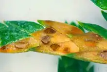 Germinating ascospores cause very early symptoms on mature foliage that appear as several small cream-coloured spots on the upper surface of individual cedar leaflets. These spots later develop into lesions, which coalesce as a discreet spot, but the entire leaf becomes brown contrasting with adjacent green, healthy leaves. Infected leaflets are scattered over a branch, but they only occur on the previous year's leaflets, and not the current year's growth. Mycelial growth occurs within individual leaflets and once sufficient growing degree days have accumulated under suitable environmental conditions, apothecia are formed.[12][56] A cross section of leaflet through an apothecium shows that the apothecium is initially covered by the leaf cuticle and a one-cell thick epidermal layer which is golden brown to brown in colour. The apothecium is raised slightly above the surrounding leaf tissue. When the epidermal covering breaks three quarters around the circumference of the apothecium, it lifts up as a scale, exposing the hymenial layer. As the exposed apothecium matures, it changes from golden brown to dark brown in colour. When moist, the cushion-like hymenial layer of the apothecium is golden-olive. At this point ascospores are released. When dry, apothecia appear much darker and the epidermal scale often folds back over the apothecium, and no further ascospores are released. Under repeated episodes of wetting and drying for up to week, ascospore release can occur. Discharged ascospores are covered with a sticky, mucilaginous coating that attach the ascospores to any type of surface.[12] Where ascospores stick to the host material, they produce a germ tube and directly penetrate the epidermis, and not through stomata. Affected leaflets often remain on the tree, weathering to a grey colour with dark cavities where spent apothecia have either shrivelled or fallen out. No anamorphic stage is known.