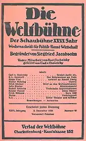 Die Weltbühne (‘The World Stage’) was a German weekly magazine for politics, art and the economy. It was founded in Berlin in 1905 as Die Schaubühne (‘The Theater’) by Siegfried Jacobsohn and was originally a theater magazine only. In 1913 it began covering economic and political topics and for the next two decades was one of the leading periodicals of Germany’s political left. It was renamed to Die Weltbühne (‘The World Stage’) on April 4, 1918, After Jacobsohn's death in December 1926, leadership of the magazine passed to Kurt Tucholsky, who turned it over to Carl von Ossietzky in May of 1927. The Nazi Party banned the publication after the Reichstag fire, and its last issue appeared on March 7, 1933. The magazine continued from exile as Die neue Weltbühne (‘The New World Stage’) until 1939. After the end of World War II, it appeared again under its original name in East Berlin, where it survived until 1993. In 1997, the magazines Ossietzky and Das Blättchen (‘The Leaflet’) followed in the tradition of their famous role model.