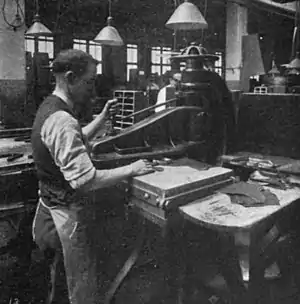 Die cutting started as a process of cutting leather for the shoe industry in the mid-19th century.[5] It is now sophisticated enough to cut through just one layer of a laminate, so it is now used on labels, postage stamps, and other stickers; this type of die cutting is known as kiss cutting.[6]