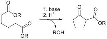 The Dieckmann condensation is the intramolecular chemical reaction of diesters with base to give β-keto esters.[1] It is named after the German chemist Walter Dieckmann (1869–1925).[2][3] The equivalent intermolecular reaction is the Claisen condensation.