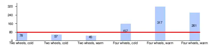 The engine software changed the engine behavior based on whether two or four wheels were rotating. In an Opel Zafira front-wheel-drive vehicle, the NOx emissions were within the 80 mg/km legal limit – but only when the vehicle was on a test stand, with the front wheels rotating and the rear wheels being stationary. When the rear, unpowered wheels were made to rotate too (which is how a front-wheel-drive vehicle behaves on the road), the NOx emission were twice the limit (cold engine) or three to four times the limit (warmed-up engine).[18][19][20]
