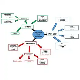 Obesity is affected by "environmental, biological, and psychosocial pressures",[18] therefore it is understandable that several limitations are established when translating results between the results of a diet induced obesity model in a lab and humans. While models are an important method of investigating the influences of obesity and drug testing, it is important to understand the limits of the model's overall ability to resemble the human obesogenic pathophysiology.[19] Such limitations can be divided into three broad categories—biological, dietary and experimental differences—factors including, but not limited to, the genetic makeup of the species or strain, the environment in which the specimen is held (temperature, light, number of animals), age, sex, the duration of the experiment, and the texture or type of rations fed to the animals.[3]