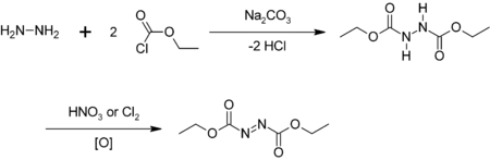 Although available commercially, diethyl azodicarboxylate can be prepared fresh in the laboratory, especially if required in pure, non-diluted form. A two-step synthesis starts from hydrazine, first by alkylation with ethyl chloroformate, followed by treating the resulting diethyl hydrazodicarboxylate with chlorine (bubbling through the solution), hypochlorous acid, concentrated nitric acid or red fuming nitric acid. The reaction is carried out in an ice bath, and the reagents are added dropwise so that the temperature does not rise above 20 °C. Diethyl hydrazodicarboxylate is a solid with melting temperature of 131–133 °C which is collected as a residue; it is significantly more stable to heating than DEAD and is conventionally dried at a temperature of about 80 °C.[4][13]
