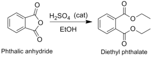 Diethyl phthalate is produced by the reaction of ethanol with phthalic anhydride, in the presence of a strong acid catalyst: