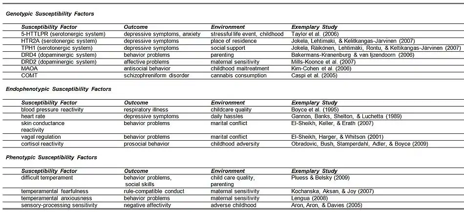 Characteristics of individuals that have been shown to moderate environmental effects in a manner consistent with the differential susceptibility hypothesis can be subdivided into three categories:[9] Genetic factors, endophenotypic factors, phenotypic factors.