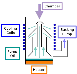 Diffusion pumps use a high speed jet of vapor to direct gas molecules in the pump throat down into the bottom of the pump and out the exhaust. They were the first type of high vacuum pumps operating in the regime of free molecular flow, where the movement of the gas molecules can be better understood as diffusion than by conventional fluid dynamics. Invented in 1915 by Wolfgang Gaede, he named it a diffusion pump since his design was based on the finding that gas cannot diffuse against the vapor stream, but will be carried with it to the exhaust.[1] However, the principle of operation might be more precisely described as gas-jet pump, since diffusion plays a role also in other high vacuum pumps. In modern textbooks, the diffusion pump is categorized as a momentum transfer pump.