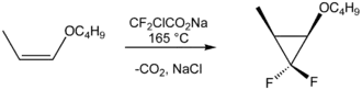 Difluorocarbene is used to generate geminal difluorocyclopropanes.
