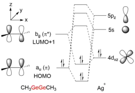 Noticing that the au(π) bonding orbital in digermynes has the ability to act as the π-electron donor, Ar1GeGeAr1 can react with AgSbF6 to form [AgAr1GeGeAr1]+SbF6− at -40 °C.[16] [AgAr1GeGeAr1]+ has a C2 axis through the silver atom which is perpandicular to the CGeGeC plain and the midpoint of the Ge-Ge bond. The silver atom is coordinated by two Ge atoms and two arenes from Dipp groups of the bulky protecting groups. The bond between GeGe moiety and Ag+ is dominated by the interaction between the HOMO of Ar1GeGeAr1 and 5s and 5p orbitals of Ag+, which claims the σ-character of the interaction, while the π-character can be explained by the relative weak interaction of Ag 4dxz orbital with π* orbital (LUMO+1). Therefore, it has been suggested that [AgAr1GeGeAr1]+ is a hybrid of π-complex and a metallacyclopropene-like σ-complex.