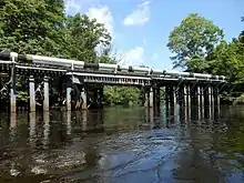 The New Haven began shifting through service onto the Dighton and Somerset in the 1890s, and was the New Haven's primary Boston-Fall River route by the late 1910s. Around 1927, all through trains were routed via Stoughton instead of the original route through Braintree.[2] Passenger service ended between Randolph and Stoughton Junction around 1927, and from Braintree Highlands to Randolph in 1938.[1] In 1932, all passenger service and through freight service ended south of Weir Junction when the drawbridge over the Taunton River was disabled after a ship hit another bridge carrying power cables. The line was taken out of service between Dean Street and Raynham that year and formally abandoned in 1937, along with the section south of Dighton.[1] The New Haven received ICC permission to abandon the section between Randolph and Stoughton Junction on June 11, 1937; it was abandoned in 1938.[1][3]