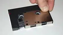 The cases that DCCs came in generally did not have the characteristic folding mechanism used for analog compact cassettes. Instead, DCC cases tended to be simple plastic boxes that were open on one of the short sides. The front side had a rectangular opening that exposed almost the entire cassette, so that any label on the cassette would be visible even when the cassette was in its case. This allowed the user to slide the cassette into and out of the case with one hand (which was seen as a major advantage for mobile use[14]), and reduced production costs, especially for prerecorded cassettes, because the case did not need a separate label. Format partner Matsushita (now Panasonic) and others did, however, produce blank cassettes (under their Panasonic brand) with a clam-shell-style case. Because DCCs have no "bulges" near the tape access holes, there is more space in the case behind the cassette to insert, for example, a booklet for a prerecorded tape, or a folded up card on which users could write the contents of the tape. In spite of the differences, the outside measurements of the standard DCC cases were exactly identical to the cases of analog compact cassettes, so they could be used in existing storage systems. The Matsushita-designed clam-shell case was slightly thinner than an analog compact cassette case is.