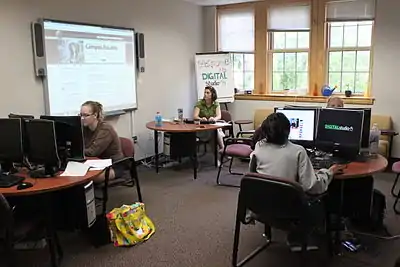 A digital studio provides both a technology-equipped space and technological/rhetorical support to students (commonly at a university) working individually or in groups on a variety of digital projects, such as designing a website, developing an electronic portfolio for a class, creating a blog, making edits, selecting images for a visual essay, or writing a script for a podcast.[1]