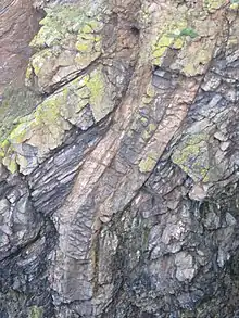 Dikes range in composition from basaltic to rhyolitic, but most are basaltic. The texture is typically slightly coarser than basalt erupted at the surface, forming a rock type called diabase. The grain size varies systematically across the dike, with the coarsest grains normally at the center of the dike.[12] Dikes formed at shallow depth commonly have a glassy or fine-grained chilled margin 1 to 5 cm thick, formed where the magma was rapidly cooled by contact with the cold surrounding rock. Shallow dikes also typically show columnar jointing perpendicular to the margins. Here the dike rock fractures into columns as it cools and contracts. These are usually 5- to 6-sided, but 3- to 4-sided columns are also common. These are fairly uniform in size within a single dike, but range from a few centimeters to over 0.3 meters across in different dikes, tending to be thicker in wider dikes. Larger columns are likely a consequence of slower cooling.[13]