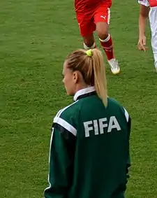 ![]() Dilek Koçbay acting as fourth official at the 2015 FIFA Women's World Cup qualification – UEFA Group 6 match Turkey vs Belarus. | |||