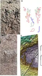 The paleontologist Gerard Gierliński examined tridactyl footprints from the Holy Cross Mountains in Poland and concluded in 1991 that they belonged to a theropod like Dilophosaurus. He named the new ichnospecies Grallator (Eubrontes) soltykovensis based on them, with a cast of footprint MGIW 1560.11.12 as the holotype.[42] In 1994 Gierliński also assigned footprints from the Höganäs Formation in Sweden discovered in 1974 to G. (E.) soltykovensis.[43] In 1996, Gierliński attributed track AC 1/7 from the Turners Falls Formation of Massachusetts, a resting trace he believed to show feather impressions, to a theropod similar to Dilophosaurus and Liliensternus, and assigned it to the ichnotaxon Grallator minisculus.[27] The paleontologist Martin Kundrát agreed that the track showed feather impressions in 2004, but this interpretation was disputed by the paleontologist Martin Lockley and colleagues in 2003 and the paleontologist Anthony J. Martin and colleagues in 2004, who considered them as sedimentological artifacts. Martin and colleagues also reassigned the track to the ichnotaxon Fulicopus lyellii.[28][29][30]