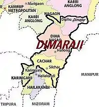 The Dimasa people of northeast India have been demanding a separate state called Dimaraji or "Dimaland" for several decades. It would comprise the Dimasa-inhabited areas, namely Dima Hasao district, parts of Cachar district, parts of Nagaon district, Hojai district and Karbi Anglong district in Assam together with part of Dimapur district in Nagaland.