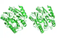 - PDB: 3I2E; Wang W, Monzingo AF, Hu S, Schaller TH, Robertus JD, Fast W (2009). "Developing Dual and Specific Inhibitors of Dimethylarginine Dimethylaminohydrolase-1 and Nitric Oxide Synthase: Toward a Targeted Polypharmacology To Control Nitric Oxide". Biochemistry. 48 (36): 8624–8635. doi:10.1021/bi9007098. PMC 2746464. PMID 19663506.; rendered via PyMOL.