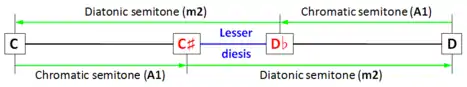 ![]() Diminished second in quarter-comma meantone (also known as lesser diesis), coinciding with the interval from C♯ to D♭, defined as the difference between m2 and A1 (117.1 − 76.0 = 41.1 cents). |