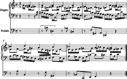 “What is a powerful surprise, and further evidence of Bach’s unique imaginative boldness, is the specific form the obbligato pedal part takes in this chorale setting: almost nothing but dissonant drops of a seventh – Adam’s fall made audible! And not just the fall, but also the attendant pain and suffering are depicted (and in a way evoked), since so many of those sevenths are diminished.”[7]