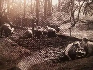 An actual project designed to excavate the hillfort was developed by professors at the newly founded archaeology department of University College, Cardiff in the mid-1950s. In 1953, archaeologists Sir Cyril Fox, Dr V.E. Nash-Williams and Dr H.N. Savoy examined a variety of sites in southern Wales to decide which would be the best training site for the university's students, and eventually came to the conclusion that the Dinas Powys hillfort would be best. After gaining permission to excavate from Sir Herbert Merrett of the Cwrt-yr-Ala Estate Company and the Forestry Commission (the owners and tenants of the land respectively), and getting a small monetary grant from the Board of Celtic Studies, excavation began in January 1954.[27] The excavations continued for four years, till 1958, mostly at weekends in spring and early summer, and also at Easter from 1954 through to 1957, and during July–August 1958. Following the financial support of the Board of Celtic Studies, grants were later made for the excavation by Glamorgan County Council, the Cambrian Archaeological Association, the British Academy, the Haverfield Trustees and the Society of Antiquaries.[27] Most of the work was undertaken by volunteers, namely students from University College Cambridge, as well as from community archaeological societies both from Wales and from the rest of Britain. For the back-filling however, manual workmen were employed due to the more physical nature of the labour.[27] The excavators decided to leave certain areas unexcavated, stating that "Sufficient areas have been left unexcavated for future workers to have some chance of testing both the observation of facts and the hypotheses presented [in their conclusions]."[28]