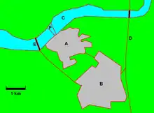 Historically, Dingcheng referred to the old town center beside the Nandu River.[2] Around 2015, a newly developed part of Dingcheng is emerging to the southeast, extending to the east side of G98 Hainan Ring Expressway. This is commonly referred to as Taling and the original may be referred to as "Laocheng" (old town).[3]