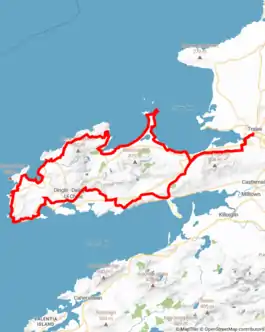 The trail begins in Tralee, following the towpath of the Tralee Ship Canal to Blennerville, after which it follows the road for a while before climbing up to a mountain track along the northern flanks of the Slieve Mish Mountains. From here it descends towards Tralee Bay and the village of Camp.[6] The next few stages – Camp to Annascaul, via Inch Strand; Annascaul to Dingle, via Lispole; and Dingle to Dunquin, via Ventry – mainly follow minor roads and boreens.[7] The latter section of the stage between Dingle and Dunquin follows a cliff path around Slea Head.[8] The section between Dunquin and Ballycurrane follows a mixture of roads, beaches and cliff paths.[9] The most mountainous stretch of the Way now follows as the trail ascends a saddle between Brandon and Masatiompan mountains.[10] At 640 metres (2,100 feet), this is the highest point reached by any of the National Waymarked Trails in Ireland.[11] The Way then descends to Brandon village and follows a trail to the village of Cloghane.[12] From Cloghane, the trail follows Fermoyle Strand, Ireland's longest beach, to Fahamore, before following roads to the village of Castlegregory.[13] The final stage follows the coastline to Camp before retracing the outward route to Tralee.[14]