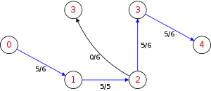 The following is a simulation of Dinic's algorithm. In the level graph , the vertices with labels in red are the values . The paths in blue form a blocking flow.