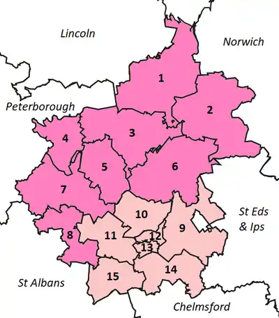 Map of deaneries in Ely Diocese, coloured by archdeaconry (Huntingdon & Wisbech, north; Cambridge, south). Key: (1) Wisbech Lynn Marshland (2) Fincham & Feltwell (3) March (4) Yaxley (5) St Ives (6) Ely (7) Huntingdon (8) St Neots (9) Fordham & Quy (10) North Stowe (11) Bourn (12) Cambridge North (13) Cambridge South (14) Granta (15) Shingay