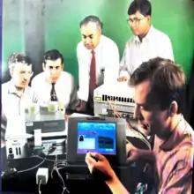 The wireless ATM network supports the delivery of multimedia information to portable computing devices of the future. Dipankar Raychaudhuri, Bob Siracusa, Cesar Johnston, Subir Biswas, and Max Ott demonstrate CCRL's WATMnet prototype. The NEC laptop computer in the foreground serves as a personal information appliance (PIA) which retrieves multimedia streams (such as MPEG video) over the microcellular wireless ATM network. The prototype system is capable of supporting standard ATM services at the portable terminal, with Quality-of-Service (QoS) control and handoff of active connections from one macrocell base station to another. The CCRL team has made seminal contributions to the field of wireless ATM, and has played a key role in forming a working group on this subject within the ATM forum.