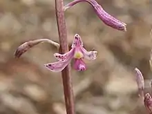 Dipodium elegantulum is a tuberous, perennial, saprophytic herb. Between August and December it produces a flowering stem 500–800 mm (20–31 in) tall bearing between twenty and sixty flowers. The flowers are pale to dark pink with a few darker spots and streaks near the tips and 20–25 mm (0.8–1 in) wide. The dorsal sepal is linear to lance-shaped, 14–17 mm (0.6–0.7 in) long, 3–4 mm (0.1–0.2 in) wide and the lateral sepals are a similar shape but slightly longer and narrower. The petals are a similar shape but slightly curved, 13–15 mm (0.5–0.6 in) long, about 3 mm (0.1 in), free from each other and the sepals. The labellum is dark pink and projects forwards, 14–20 mm (0.6–0.8 in) long, 4–5 mm (0.2–0.2 in) wide with an upturned tip and a narrow central band of mauve hairs up to 0.5 mm (0.02 in) long.[3][4]