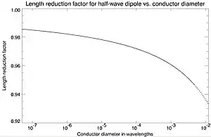 where λ is the free-space wavelength, c is the speed of light in free space, and f is the frequency. The adjustment factor k which causes feedpoint reactance to be eliminated, depends on the diameter of the conductor,[23] as is plotted in the accompanying graph. k ranges from about .98 for thin wires (diameter, 0.00001 wavelengths) to about .94 for thick conductors (diameter, 0.008 wavelengths). This is because the effect of antenna length on reactance (upper graph) is much greater for thinner conductors, so that a smaller deviation from the exact half wavelength is required in order to cancel the 43 Ω inductive reactance it has when exactly λ/2. For the same reason, antennas with thicker conductors have a wider operating bandwidth over which they attain a practical standing wave ratio which is degraded by any remaining reactance.