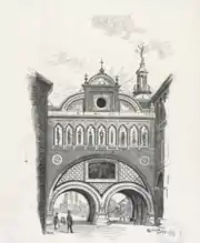 The arches have granite rustication. Above them there is a diagonal pattern in glazed and red tiles.