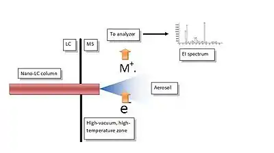 A direct electron ionization liquid chromatography–mass spectrometry interface (Direct-EI LC-MS interface ) is a technique for coupling liquid chromatography and mass spectrometry (LC-MS) based on the direct introduction of the liquid effluent into an electron ionization (EI) source.[1] Library searchable mass spectra are generated. Gas-phase EI has many applications for the detection of HPLC amenable compounds showing minimal adverse matrix effects. The direct-EI LC-MS interface provides access to well-characterized electron ionization data for a variety of LC applications and readily interpretable spectra from electronic libraries for environmental, food safety, pharmaceutical, biomedical, and other applications.[2][3]
