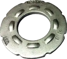 A subset of the standard DTIs described above is the squirter-type DTI that contains a small amount of material in the cavity of each protrusion. Squirter-type DTIs are mechanically and metallurgically identical to the standard DTIs described above, except that as the protrusions of squirter-type DTIs collapse upon tightening, the cavity material is expelled to the outer diameter of the device, giving a visual indication of protrusion compression, i.e. bolt tension.[7] While not approved by the ASTM or specifically mentioned within the RCSC specification, squirter-type DTIs are allowable because the RCSC specification requires all structural DTIs to conform the ASTM F959 standard, whose reference documentation includes the ASME B18.2.6 standard. Since ASME B18.2.6 section 5.1 permits the inclusion of features to facilitate silicone-emitting DTIs, squirter-type DTIs are permissible and can be installed and inspected per the RCSC specification.