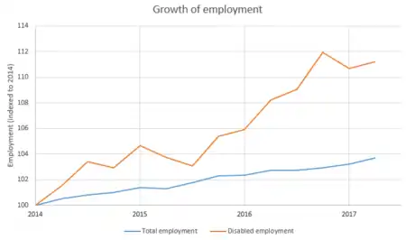 The employment rate for disabled people of working age in the UK is 45%, whereas those without a disability it is 77%.[29]: 16 This is in spite of The Equality Act 2010 requiring employers to make reasonable adjustments for a disabled person so they are not at a 'substantial disadvantage'.[30] However this Act, and previous acts,[31] has had a positive impact, for example, Sainsbury's has recruited over 2,000 disabled people within four years,[29]: 19 Marks & Spenser's have taken on over 1,000 disabled people,[32] and BT has provided sustainable opportunities for over 300 disabled people since 2003.[32]